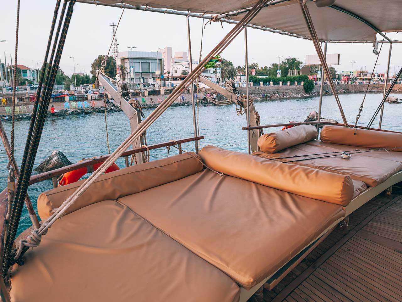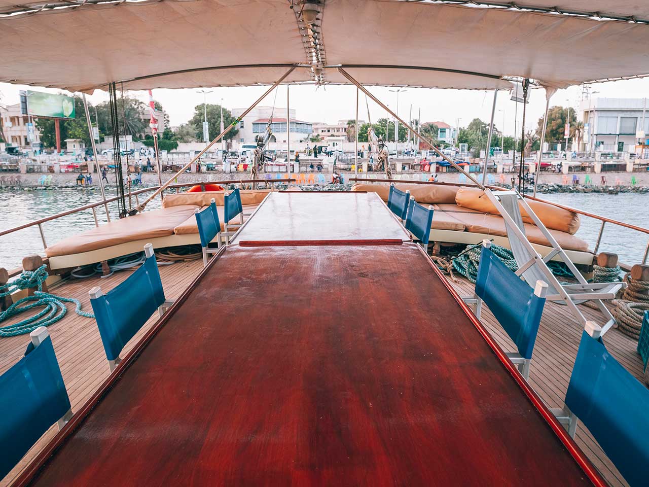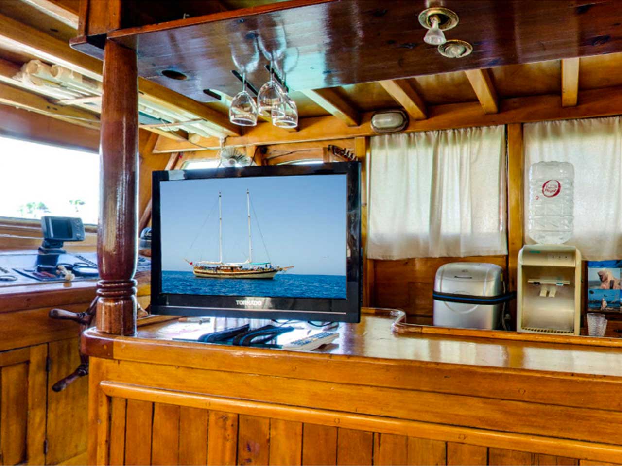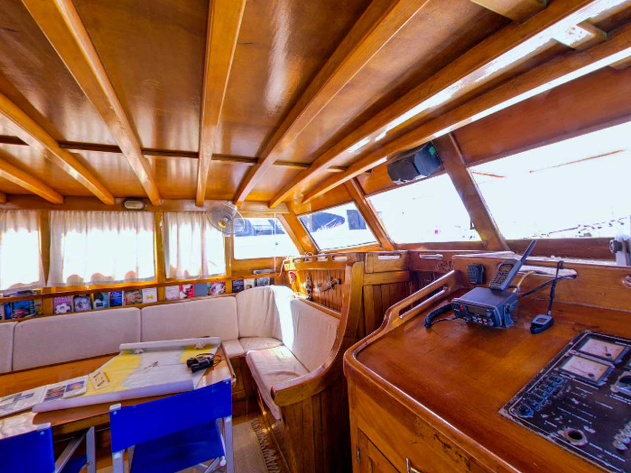 Toute la vie à bord se déroule au pont principal. À l’arrière, on trouve un vaste espace extérieur avec une grande table pour les repas et un coin détente, heureusement ombragé. À l’avant du bateau se trouve la plateforme de plongée. Entre ces deux espaces, le salon, le bar et le poste de pilotage.