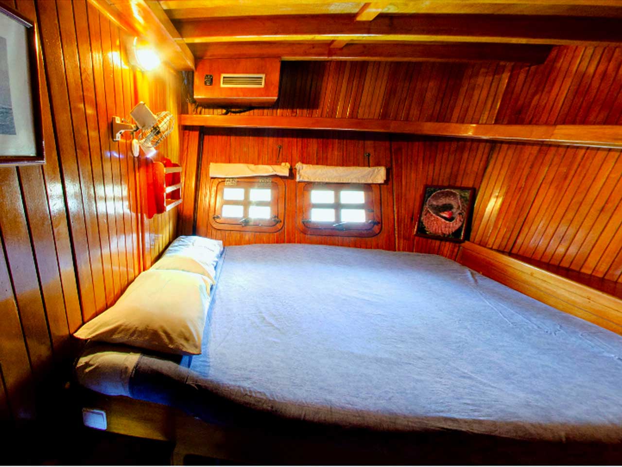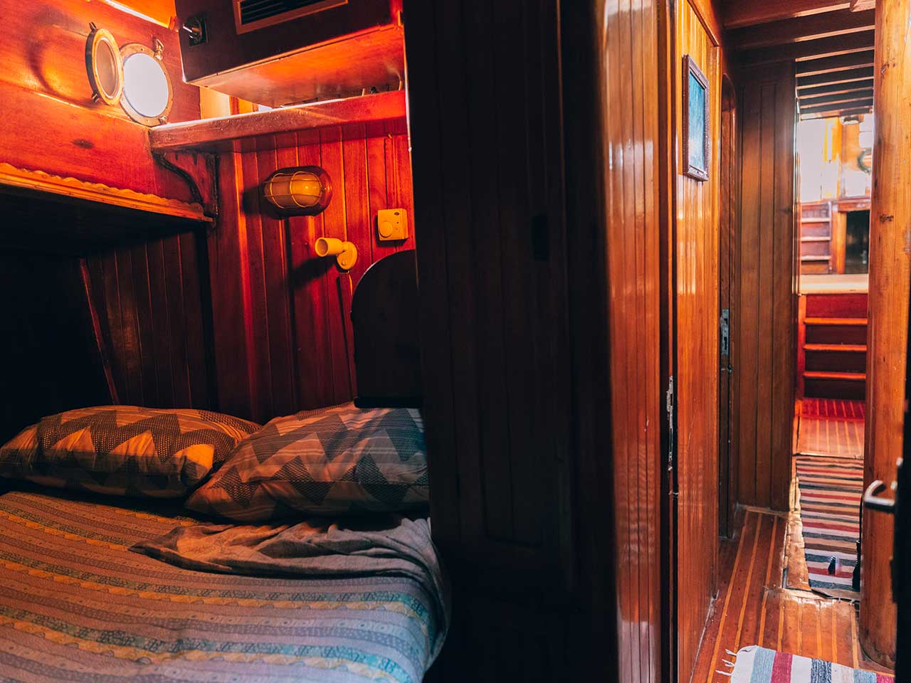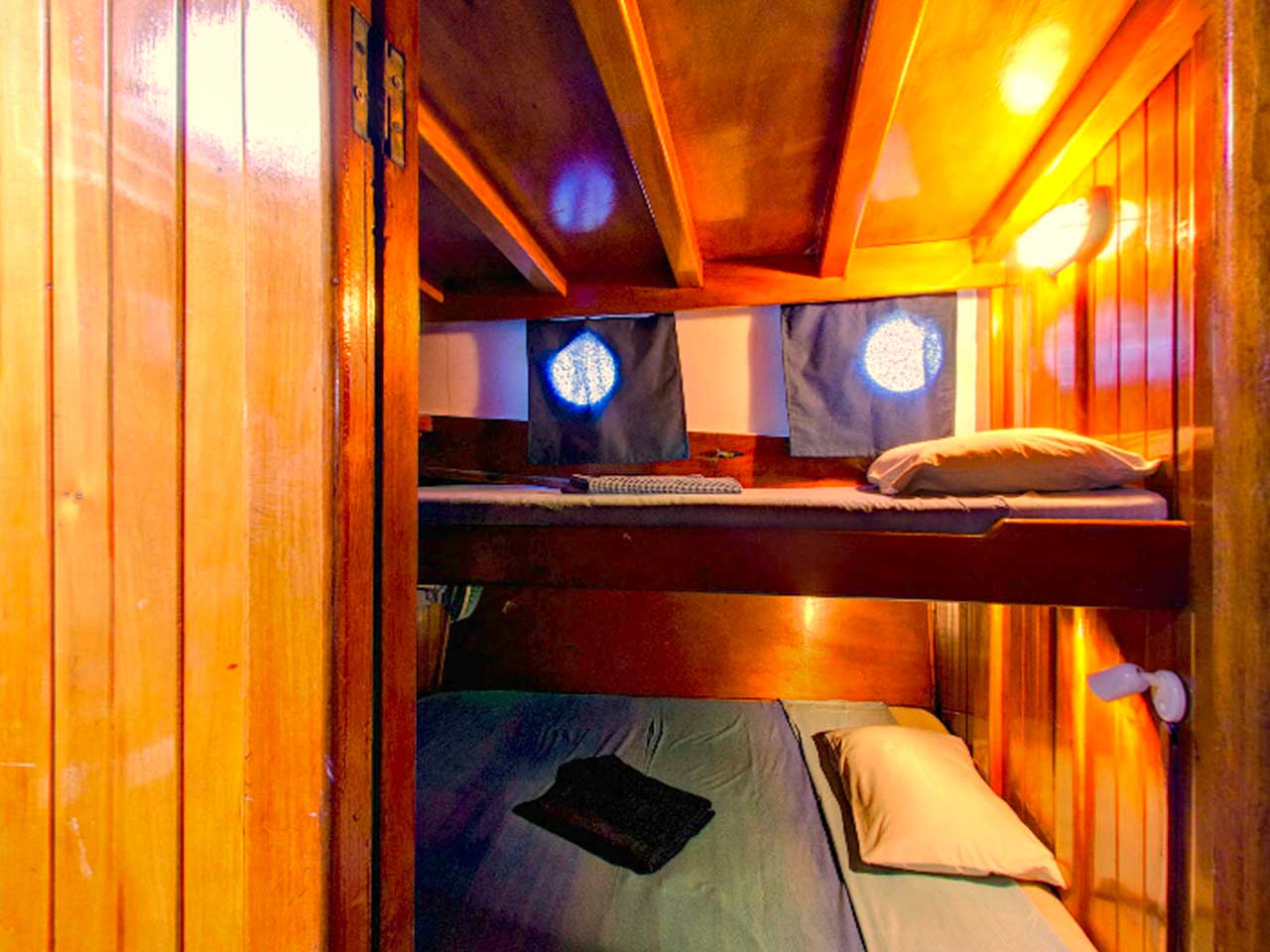 | Aménagements cabines | 10 cabines : 7 cabines avec douche et toilettes privatives, air conditionné. 3 cabines avec lits superposés, 2 cabines avec lits côte à côte, 2 cabines avec lit double. |