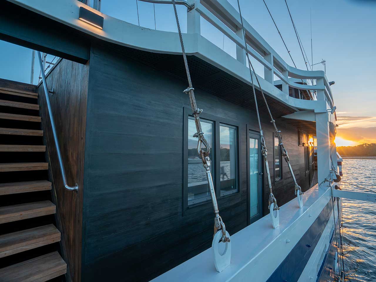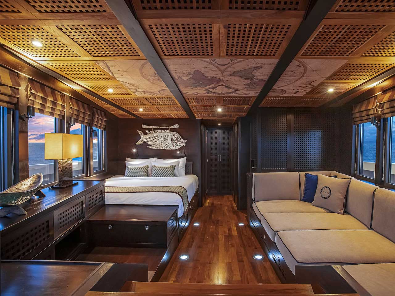 | Aménagements cabines | 9 cabines avec air conditionné à contrôle individuel et salle de bains avec toilettes privatives, réparties sur deux ponts : Pont inférieur : 6 cabines Sea Star avec deux lits simples ou un lit double, Pont principal : 1 Dolphin Suite de 18 m2 avec lit queen-size ou deux lits simples, 1 Cowrie Suite de 20 m2 avec lit queen-size ou deux lits simples et un sofa convertible en lit supplémentaire, 1 Owner’s Manta Suite de 60 m2 avec lit queen-size, sofa et terrasse privative. |