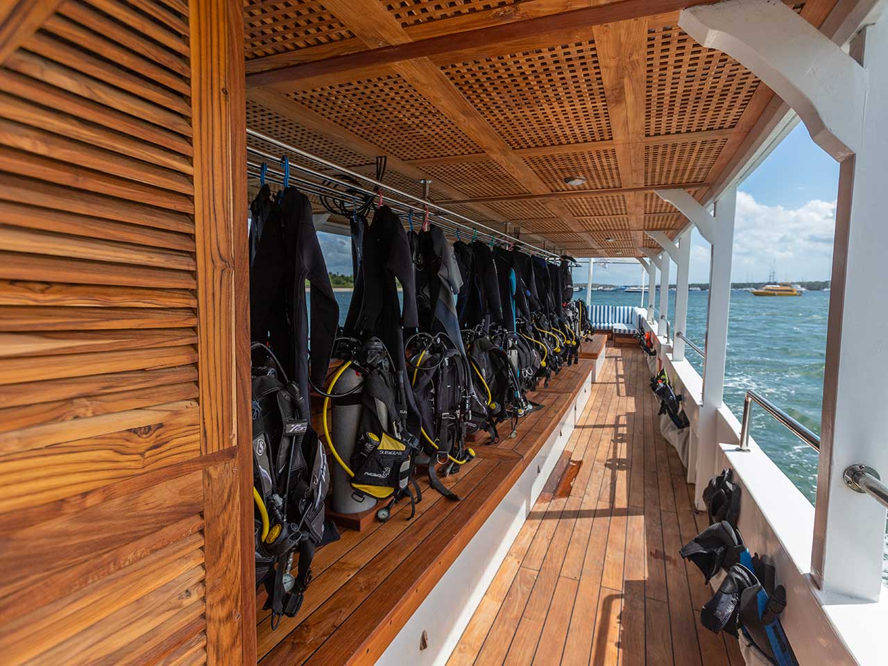 Vous choisirez parmi 3 possibilités d’activités à bord, les plongées, les massages ou les deux si le choix s’avère trop difficile. Les journées ne sont donc pas uniquement rythmées par les plongées, mais aussi par d’agréables séances de massage et de yoga. Scubaspa Zen dispose pour cela d’un véritable Spa et embarque à son bord des professionnels qui seront aux petits soins. Les non-plongeurs sont donc les bienvenus, pour profiter du Spa entre deux excursions et séances de snorkeling.