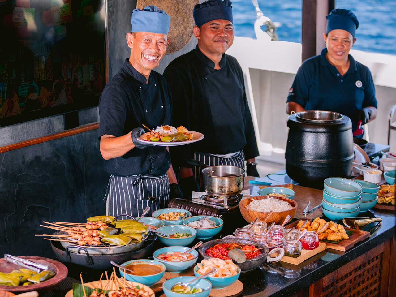 À l’exception des dîners, les repas sont servis sous forme de buffet et des propositions originales et généreuses sont proposées tous les jours par les trois chefs à bord. Leur cuisine créative et aux inspirations multiples fait généralement le bonheur de tous les convives.