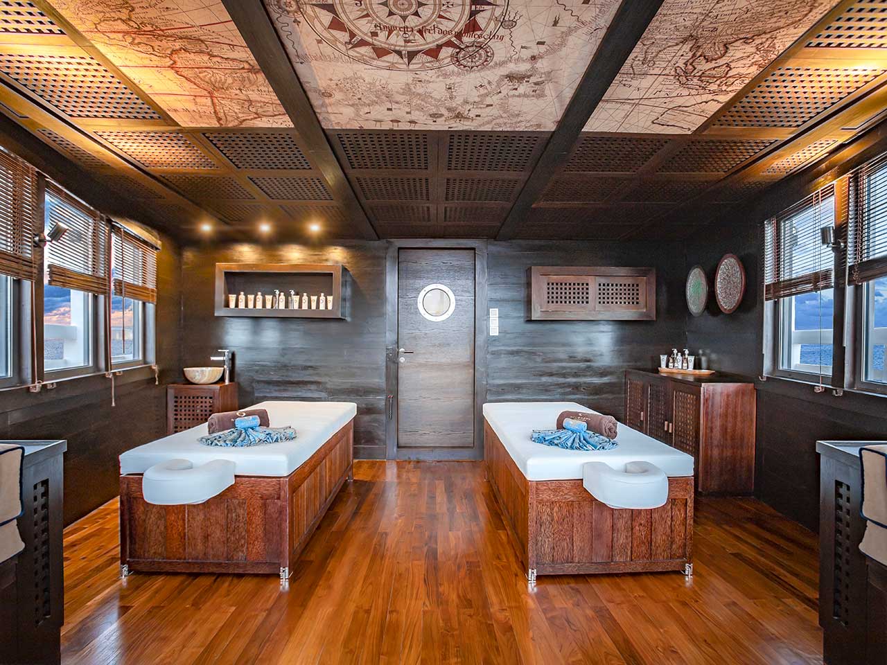 Enfin, la Owner’s Manta Suite de 60 m2 dispose de sa propre terrasse et d’un living-room. Vous pourrez demander que vos massages se déroulent dans votre cabine, tout comme le service en chambre si l’envie vous prenait de vous offrir un dîner en toute intimité.