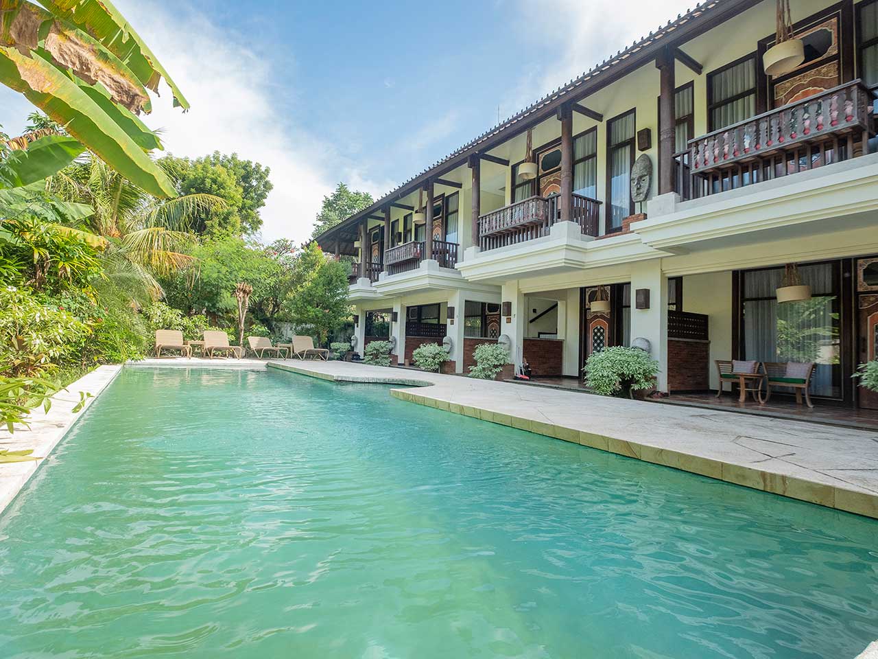 L’hôtel est conçu de la même façon que son voisin le Amertha Bali Villas, mais il est plus accessible aux budgets contraints. Tous deux appartiennent d’ailleurs au même propriétaire. Celui-ci a imaginé les deux hôtels de façon à proposer des hébergements qui conviendraient à tous. Les couples en voyage de noces préféreront un bungalow indépendant en front de mer, les jeunes parents apprécieront la chambre séparée d’une des suites familiales, ou encore le groupe d’amis qui se retrouve après plusieurs années pourra se faire plaisir dans une villa indépendante.