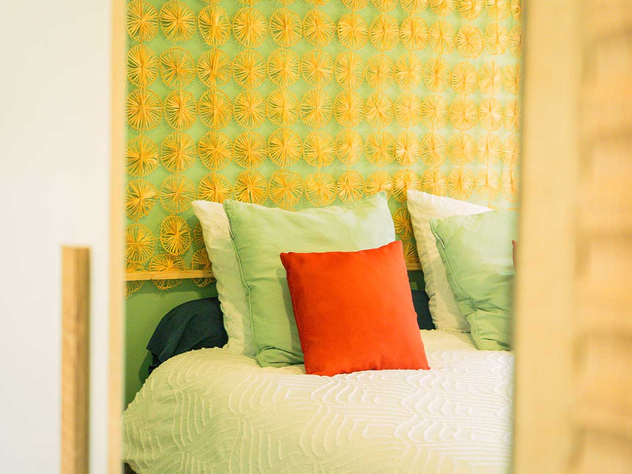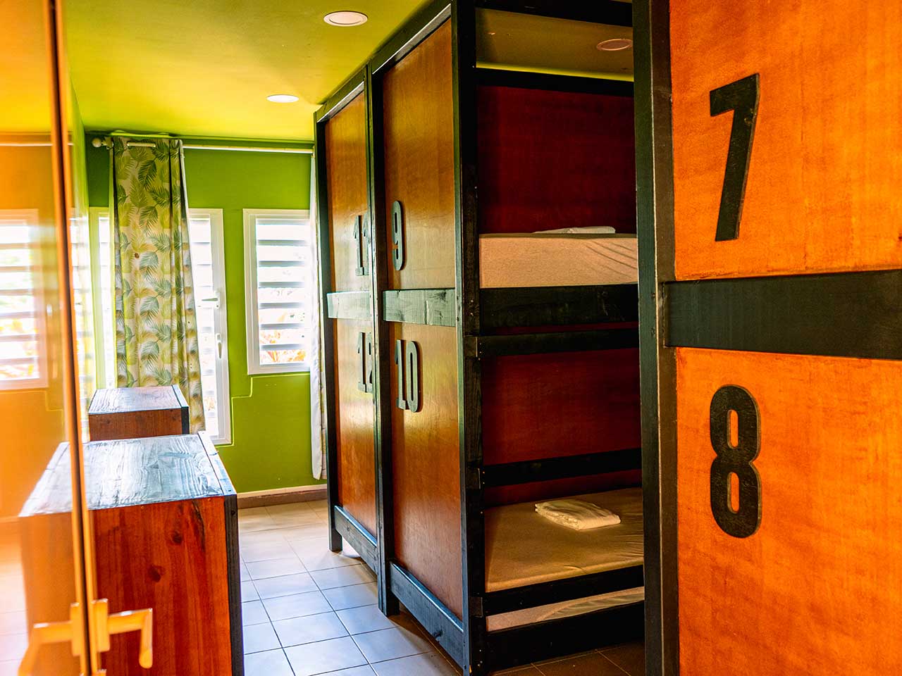 Le gîte dispose de deux dortoirs de 6 personnes et de 3 chambres doubles, répartis autour d’un vaste espace de vie central. Les dortoirs sont malgré tout assez intimistes, dans la mesure où chaque lit superposé dispose d’un rideau qui permet de s’isoler, avec une prise USB et une liseuse individuelle. Chacun bénéficie aussi d’un placard sécurisé pour y laisser ses effets personnels.