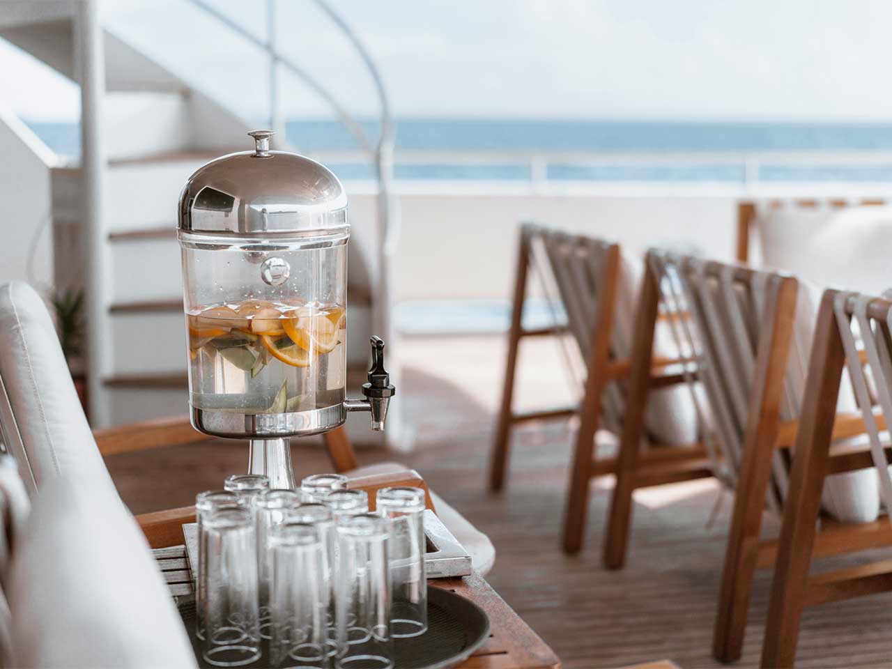 Tous vos repas seront servis dans la grande salle à manger située sur le pont principal. À ce même niveau, vous trouverez à l’extérieur, un bar et un grand salon, ainsi qu’un bain à jets.