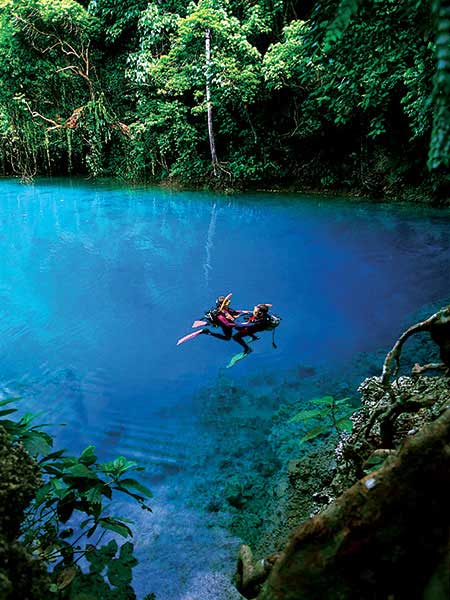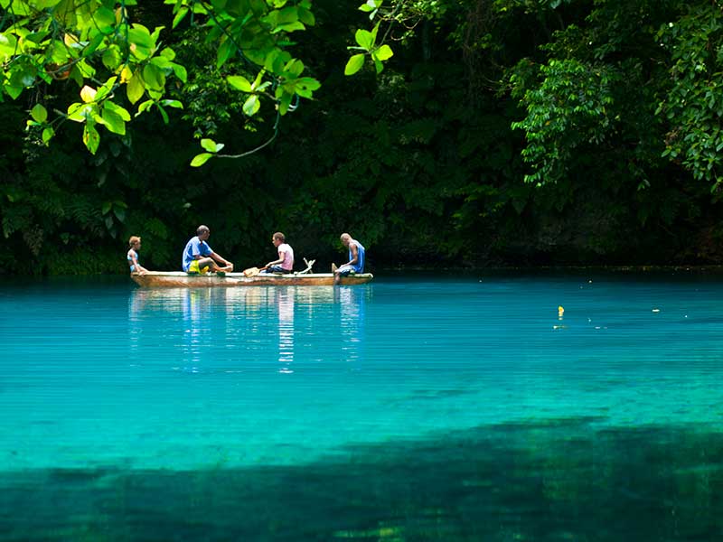 Votre premier arrêt sera au trou bleu de Matevulu. Vous remonterez la rivière en pirogue dans une nature sauvage pour arriver ensuite dans un trou d’eau naturel d’un bleu extraordinaire ! On dit qu’il est profond de près de 20 m, et son diamètre est de 20 m également. Les trous bleus sont vraiment une des particularités de Santo. Ce sont des résurgences de sources d’eau douce qui traversent le sous-sol calcaire et la roche de corail. La pureté de l’eau et la lumière leur donnent ces spectaculaires couleurs aux nuances de bleus incroyables. Ils sont très photogéniques grâce aux contrastes des couleurs…