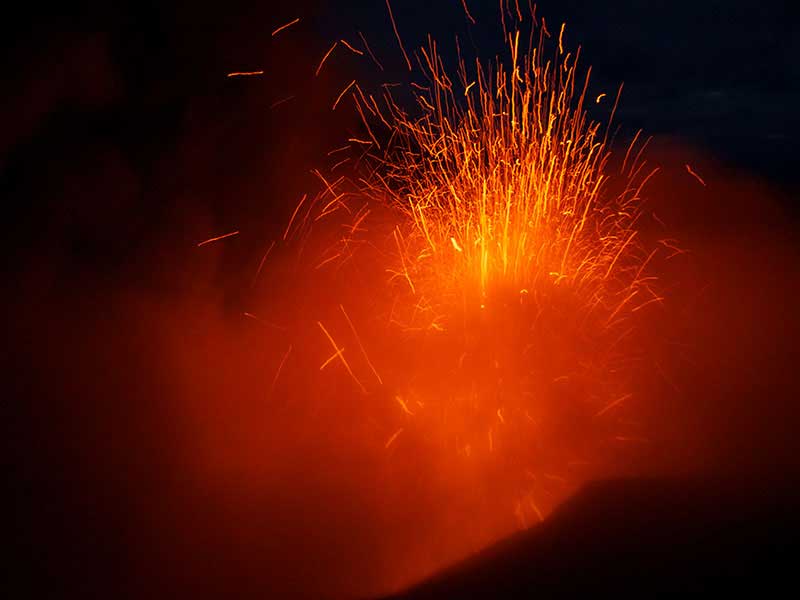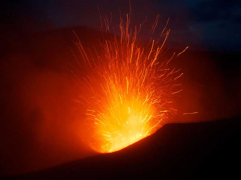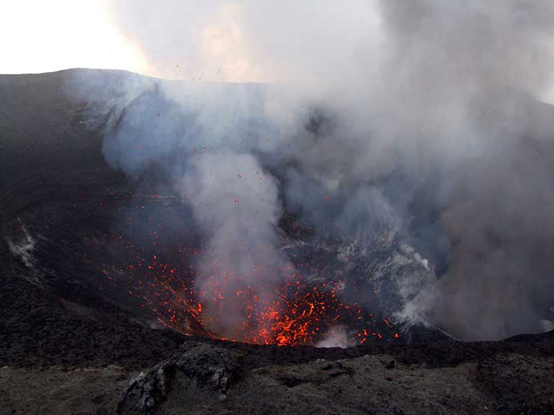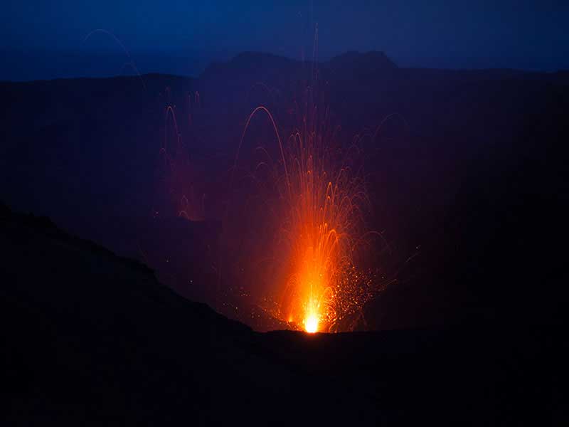 Après le déjeuner, départ pour une excursion au volcan Yasur. Vous traverserez les plaines de White Grass avec ses paysages de cultures dont des plantations de café, et passerez à proximité de villages avant d’arriver dans un paysage surprenant. Peu à peu vous constaterez que le sable noir est partout : il s’agit de cendres volcaniques projetées par le volcan. Vous contemplerez des paysages désolés, comme si vous étiez sur la lune. Une route a été construite et conduit les visiteurs à un parking, à seulement 150 m du bord du cratère. Cela fait du Yasur le volcan actif le plus accessible au monde. C’est globalement une excursion que tout le monde peut faire, il suffit d’avoir des chaussures confortables et une condition physique raisonnable pour marcher dans le sable sur une pente douce, en direction du cratère. Du haut de ses 361 m, vous pourrez observer les fumerolles et la lave bouillante. On voit et on entend clairement les éruptions de magma. C’est comme assister à un feu d’artifice, en direct du centre de la terre. L’activité du volcan est variable, mais elle est suivie de près par les volcanologues. Il est possible, qu’en cas de danger, vous ne puissiez y accéder.